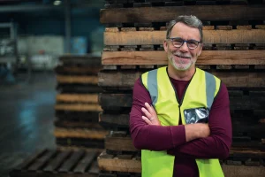 A man smiling whilst working on an assembly line